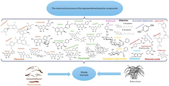 The chemical structures of the representative bioactive compounds from Prunus and Rubus woody biomass with health benefits.