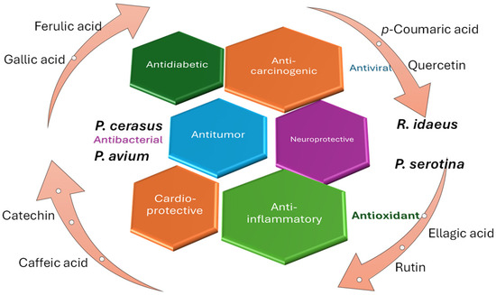 Compounds such as salicylic acid and astragalin from R. idaeus [15]; juglanin and isorhamnetin from P. serotina [17,139]; taxifolin, chrysin, and vanillin from P. avium [7,22]; phloridzin and rutin from P. cerasus [21,29] could exhibit synergistic action, which would enhance the individual pharmacological activities.