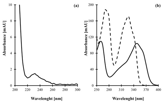 (a) UV absorption spectrum of tPro (100 µmol/L) obtained by analyzing its standard solution prepared in water, assayed using a UV-1900 spectrophotometer. (b) UV absorption spectra of tPro-CMQT derivative (solid line, 100 µmol/L) and CMQT (dashed line, 15 mmol/L) obtained by analyzing quality control sample assayed according to procedures described in Section 3.5 and Section 3.6.