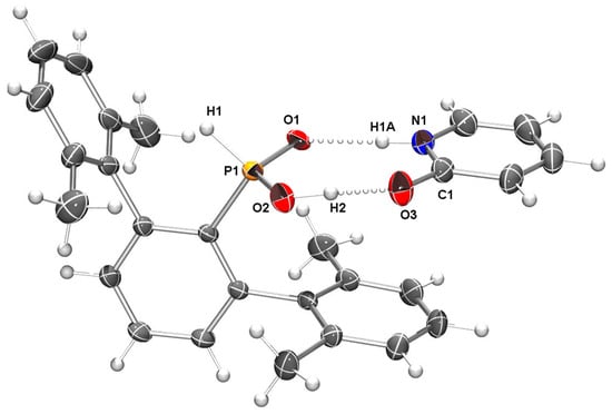 Slow evaporation of the solvent from CDCl3 solutions of NOPONXyl2, prepared with the addition of one drop of D2O, allowed the isolation of a colorless crystalline material, which was identified by SCXRD analyses as the hydrogen-bonded adduct of the phosphinic acid 1 with 2-pyridone (Figure 2). The O–H···O interaction involves the hydroxyl hydrogen H2 of the phosphinic acid (donor, O2) and the carbonyl oxygen of the pyridone ring (acceptor, O3), with an O2···O3 (donor···acceptor) distance of 2.445(3) Å, an H2···O3 (H···acceptor) distance of 1.46(5) Å, and a corresponding angle of 169(5)°, consistent with a strong and highly directional hydrogen bond. An additional H-bond is observed between the nitrogen atom N1 of the pyridone and the phosphoryl oxygen O1 (N1···O1: 2.693(3) Å; O1···H1A: 1.81(4) Å; N1–H1A···O1: 178°). This structural arrangement is in line with similar hydrogen bond motifs observed in related phosphinic acid structures [32,33,34], all showing P(=O)OH···O = C hydrogen bonds with comparable geometrical parameters (O–H distances ≈ 0.82–0.95 Å, H···O distances ≈ 1.4–1.5 Å, and O···O distances ≈ 2.4–2.6 Å).