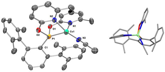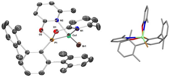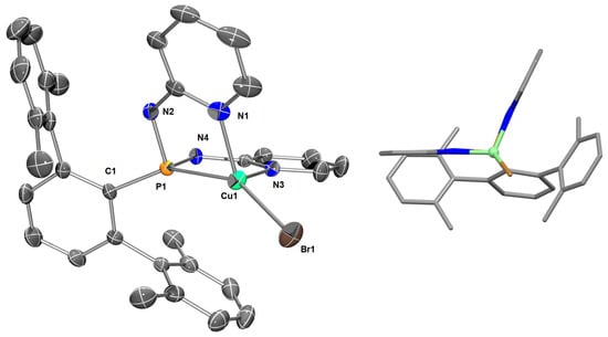 The slow diffusion of petroleum ether into dichloromethane solutions of complexes 2b, 2c, and 3b at approximately −20 °C yielded single crystals suitable for SCXRD analysis, enabling the determination of their molecular structures in the solid state. The corresponding ORTEP representations are shown in Figure 3, Figure 4 and Figure 5, respectively, along with the corresponding lists of selected bond distances and angles. In all three complexes, the NPN ligands adopt a κ3 coordination mode, with the metal center lying in a markedly distorted tetrahedral environment, resembling a disphenoidal or seesaw-like arrangement. The bond angles at copper range from ca. 80–85°, corresponding to the P-Cu-N angles within the cupracycles, to ca. 130–150° for the P-Cu-Br and P-Cu-NCMe angles. These angular distortions are reflected in the values of the four-coordinate geometry index, τ4 [35], which are 0.68, 0.69, and 0.67 for complexes 2b, 2c, and 3b, respectively. Notably, as observed in the right-side views shown in Figure 3, Figure 4 and Figure 5, the cupracycles in complex 2c are nearly perfectly planar, whereas those in 2b and 3b appear slightly twisted, likely due to the increased steric hindrance introduced by the methyl substituent on the pyridyl rings.