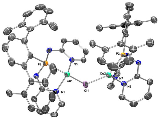 Terphenyl groups have shown the ability to stabilize unsaturated coordination compounds by means of metal–carbon secondary interactions [26,27,28,29,30,31]. Taking this into account, we reacted complex 2b with AgBF4 in dichloromethane, aiming to replace the Cu-Br bond with a weaker non-covalent interaction involving the terphenyl ring. The 31P{1H} NMR spectrum of the crude material obtained after filtration and evaporation of the volatiles revealed the formation of two new species associated with singlet resonances at 23.5 ppm and 25.5 ppm. The slow evaporation of CDCl3 from the NMR tube yielded pale yellow crystals of the dinuclear complex [Cu2Cl(N2PN2Xyl2)2]BF4, 4, in which two [Cu(N2PN2Xyl2)]+ units are bridged by a chloride anion (Figure 6). Although no mechanistic studies were performed, the formation of compound 4 can likely be attributed to the use of dichloromethane as the reaction medium together with the high reactivity of the in situ-generated [Cu(N2PN2Xyl2)]+ cation. Furthermore, the slight difference observed between the two 31P{1H} NMR signals in the initial mixture suggests that the second product is plausibly the bromine-bridged analog of 4.
