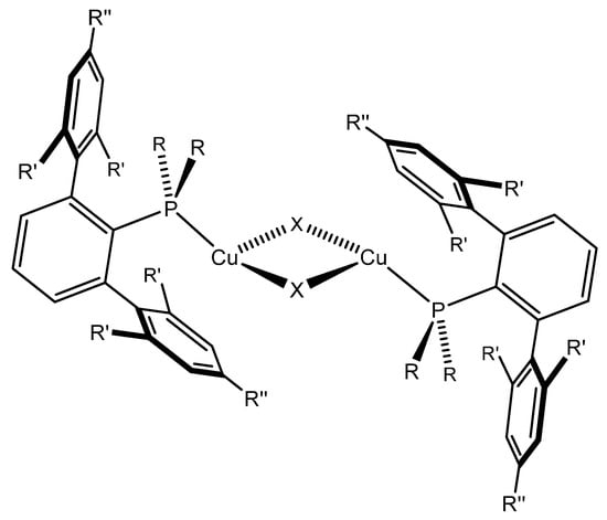In recent years, we have dedicated much effort to the synthesis of P(III) compounds functionalized with terphenyl groups, with the general objective of expanding this class of ligands and studying their coordination chemistry and catalytic properties in combination with late transition metals [26,27,28,29,30,31]. In particular, we successfully synthesized a family of dinuclear Cu(I) complexes of the general formula CuX(PR2Ar′) (X = Cl, Br, I; Ar′ = substituted m-terphenyl; R = alkyl, Scheme 1), which performed remarkably as precatalysts in copper-catalyzed azide–alkyne cycloaddition reactions on water [29].