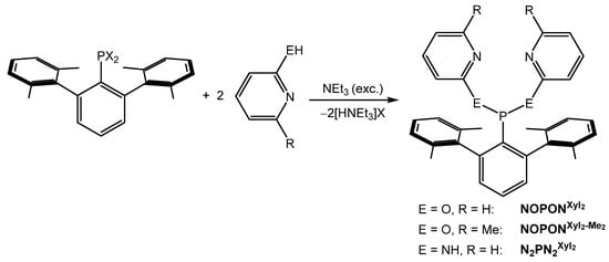 On the basis of our recently reported procedures for the preparation of terphenyl-phosphonite ligands [27], we reacted the dihalophosphines PArXyl2X2 (X = Cl, Br; ArXyl2 = 2,6-bis (2,6-dimethylphenyl) phenyl) with the pyridine derivatives 2-hydroxypyridine, 2-hydroxy-6-methylpyridine, and 2-aminopyridine at an approximately 1.9:1 molar ratio in the presence of triethylamine to selectively produce the corresponding NPN ligands NOPONXyl2, NOPONXyl2-e2, and N2PN2Xyl2, respectively, as colorless solid materials, in good yields (Scheme 2). Optimization of the reaction conditions implied the use of a slight excess of the parent dihalophosphines in order to avoid the presence of unreacted pyridines in the reaction mixture, which otherwise would require laborious work-up operations. Conversely, small amounts of residual PArXyl2X2 could easily be removed by washing the crude solid products with pentane.