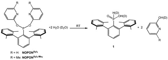 The diaminophosphine N2PN2Xyl2 is indefinitely air-stable at room temperature, both as a pure solid material and dissolved in common organic solvents such as CHCl3, CH2Cl2, THF, and C6H6, even upon the addition of water. Contrarily, the phosphonites NOPONXyl2 and NOPONXyl2-Me2 have to be stored under an inert atmosphere of N2 or Ar to avoid hydrolysis yielding the corresponding phosphinic acid [27]. Thus, solid samples of pure NOPONXyl2 quantitatively converted into (O=)PH(OH)ArXyl2 (1) and 2-hydoxypyridine after 72 h of exposure to air (Scheme 3). The same reaction products formed in approximately 24 h when pure samples of NOPONXyl2 were dissolved in THF/D2O or CDCl3/D2O mixtures. The presence of a P—H (or P—D) bond in the newly formed phosphinic acid 1 in CDCl3 solution, i.e., the predominance of the P(V) tautomer (O=)PH(OH)ArXyl2 over the P(III) one, P(OH)2ArXyl2, was doubly proven by the following: (a) a doublet centered at 6.93 ppm with a 1JHP coupling constant of 575 Hz in the 1H NMR spectrum of samples of 1 produced without the addition of D2O; (b) a 1:1:1 triplet at 22.5 ppm (1JPD = 117 Hz) in the 31P{1H} NMR spectrum samples of 1 obtained by reactions with D2O.