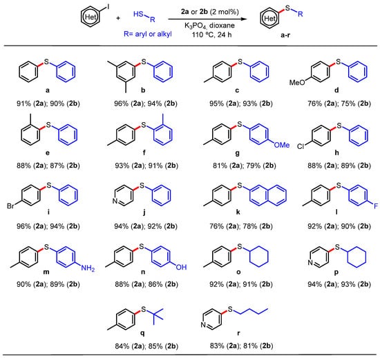 Scope of the C–S coupling of (hetero)aryl iodides with thiophenols and aliphatic thiols catalyzed by complexes 2a and 2b. Reaction conditions: aryl halide (1.2 mmol), thiophenol (1.0 mmol), K3PO4 (2.0 mmol), 2a or 2b (2 mol %), dioxane (1 mL), 110 °C, 24 h. Isolated yield of products (average of two runs).