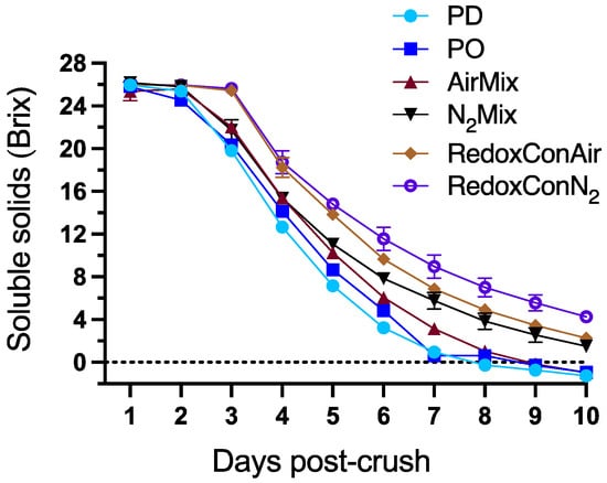 While the programmable logic controller was set to inject air into RedoxConAir wines if the ORP dropped to −40 mV or below, this limit had not been reached in the first 2 days of maceration, due to the absence of active fermentation. In turn, these wines received no cap management or air injection until a manually activated 1 h air mixing was applied approximately 40 h after yeast inoculation. Similarly, N2Mix and RedoxConN2 wines received no supplementary air throughout alcoholic fermentation. Consequently, N2Mix, RedoxConAir, and RedoxConN2 wines failed to reach 0 Brix during the 10-day maceration. Previous research has shown successful completion of alcoholic fermentation within as few as four days in cases of no cap management or nitrogen mixing, and therefore no oxygen additions [8]. The present results suggest that under conditions of potentially low yeast biomass and cell viability, as indicated by the extended lag phase and sluggish fermentation, oxygen additions may be necessary to ensure the onset and progress of alcoholic fermentation.