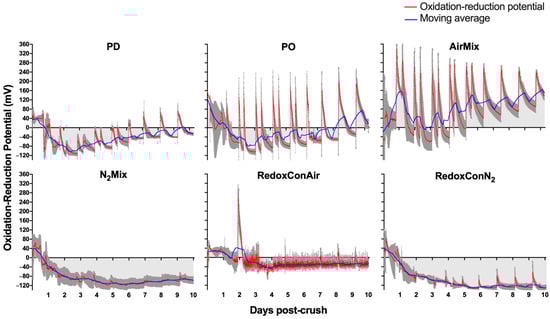In contrast, N2Mix and RedoxConN2 wines declined in ORP following inoculation of Saccharomyces cerevisiae and equilibrated with minimal response in ORP to injections of inert N2 gas. Minimum ORP values of −115 mV were recorded in these treatments, and unlike PD, PO, and AirMix wines, the N2 based treatments did not result in an upward trend in the moving average ORP over time.