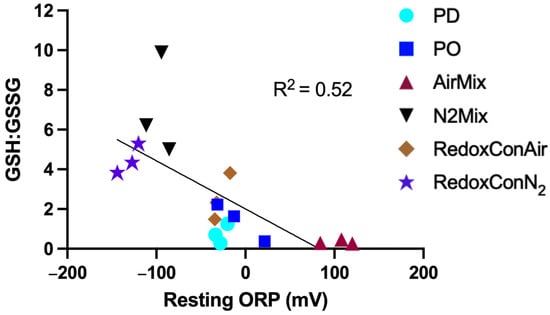 Linear regression of the GSH:GSSG ratio and the resting ORP at the end of alcoholic fermentation (i.e., pressing) of Pinot noir wines made with selected cap management protocols.
