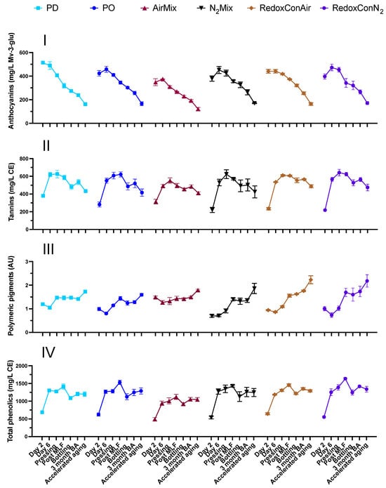 Phenolic measurements of (from top to bottom) anthocyanins (I), tannins (II), polymeric pigments (III), and total phenolics (IV) at selected stages of winemaking, bottle aging (BA), and accelerated aging. Points represent the mean of three tank replicates (n = 3), and bars represent the standard error of the mean.