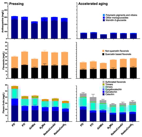 Accelerated aging resulted in a shift in composition of flavan-3-ols among the wines. While no significant concentrations of sulfonated flavan-3-ol adducts were detected in any treatment at pressing, the flavan-3-ol monomers, dimers, and trimers were comprised of between 13% (N2Mix) and 24% (PO) sulfonated adducts after accelerated aging, as has been reported due to wine aging previously [70].