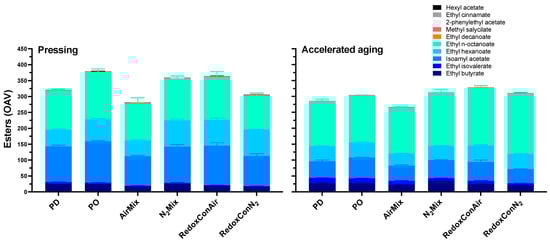 Interestingly, while the total concentration of measured volatiles reduced significantly, ethyl n-octanoate and ethyl isovalerate increased. Ethyl isovalerate was a minor contributor to the aroma profile of the wines at pressing, with OAVs below 4 in all wines. However, after accelerated aging, this compound ranged from 7 in RedoxConN2 wines to 17 in PD wines.