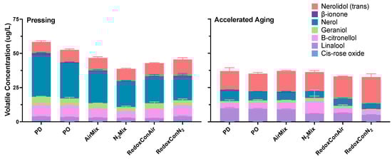 After accelerated aging, trans-nerolidol increased in all treatments, with the largest increase being in RedoxConAir wines which showed 69% greater concentrations than at pressing. Simultaneous decreases occurred in nerol and geraniol concentrations in all wines. Previous research has shown the decrease of nerol and geraniol during accelerated aging of Valpolicella wines and the paired formation of terpineol, among other cyclic terpenoids that were not measured in the present study [73] but may have contributed to the aromatic development of these wines during aging.