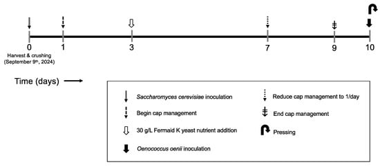 An overview of the experimental design applied during alcoholic fermentation is shown in Figure 10. Immediately after crushing, all wines received a 2.5 L acidified (4 g/L tartaric acid) water addition. These additions to each tank ameliorated high fermentable sugar content and thus potential alcohol. At pressing, all wines were inoculated with Oenococcus oenii malolactic bacteria (MLB) (Lalvin VP41, Lallemand, Rexdale, ON, Canada). Delaying malolactic fermentation until the end of alcoholic fermentation ensured that the oxidation-reduction potential (ORP) data reflected only the activity of Saccharomyces cerevisiae, without the influence of concurrent malolactic fermentation. Extraction during maceration was managed according to commercial standard practices, with cap management reduced to one session per day after day 7 of maceration and subsequently to zero cap management sessions per day on day 9 (Figure 10). Maceration time was set to 10 days to follow industry standard practices for red wines, achieving phenolic and aromatic extraction from grape solids without the effects of extended maceration described previously [11,12,43].