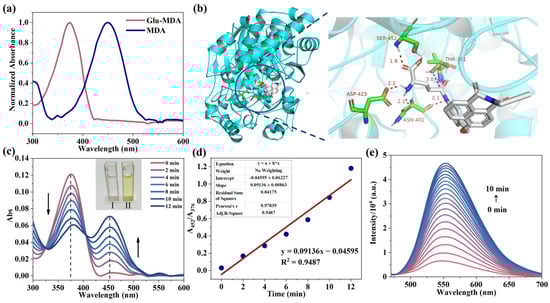 (a) The normalized absorption spectra of probe Glu-MDA (10 μM) and fluorophore MDA (10 μM) in DMSO/PBS (1:4 v/v) mixed solvent. (b) Molecular docking results of probe Glu-MDA and GGT. (c) The UV absorption of the probe Glu-MDA (10 μM) changes over time after the addition of GGT (2 U/L). Illustration: solution image before and after adding GGT. I: before adding GGT; II: after adding GGT. (d) The linear relationship between A452/A376 and time after adding GGT (2 U/L) to the probe Glu-MDA (10 μM) solution. (e) The fluorescence spectra of the probe Glu-MDA (10 μM) changes over time in DMSO/PBS (1:4 v/v) buffer after the addition of GGT (2 U/L); λex = 450 nm.