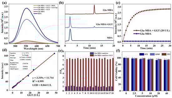 (a) The fluorescence spectra of MDA and Glu-MDA under different treatments: MDA (10 μM), Glu-MDA (10 μM), Glu-MDA (10 μM) + GGT (10 U/L), Glu-MDA (10 μM) + GGT (10 U/L) + GGsTop (0.1 mM), and Glu-MDA (10 μM) + GGT (10 U/L) + DON (0.1 mM). λex = 450 nm and λem = 550 nm. (b) HPCL analysis of Glu-MDA, Glu-MDA + GGT, and MDA. (c) Fluorescence kinetics of Glu-MDA (10 µM) on GGT (20 U/L). λex = 450 nm and λem = 550 nm. (d) Glu-MDA probe detection limit for GGT. (e) Fluorescence response of Glu-MDA (10 μM) to GGT (2 U/L) and various analytes at 550 nm. Analytes 1–18: None, NaNO3, Na2SO3, NaCl, KCl, CaCl2, H2O2, L-ascorbic acid, Glucose, Phenylalanine (Phe), Proline (Pro), Alanine (Ala), Homocysteine (Hcy), Glutathione (GSH), Glutathione Reductase (GR), Glutathione Peroxidase (GSH-Px), Glutathione S-transferase (GST), and Glutamate Cysteine Ligase (GCL). Data are presented as the mean value ± SD (n = 3). (f) Cytotoxicity of different concentrations of Glu-MDA on 4T1 cells, A549 cells, and 3T3 cells. Data are presented as mean ± standard deviation (SD) (n = 3).
