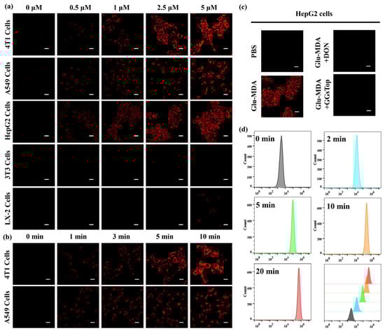 Concurrently, the potential of Glu-MDA for GGT detection was further evaluated by flow cytometry [41]. A549 cells were exposed to 5 μM of Glu-MDA for varying durations. Afterward, the cells were collected, and the number of stained cells were recorded. The results demonstrated that, in comparison with the blank group, the fluorescence intensity and the number of stained cells increased significantly over time, thereby validating the feasibility of Glu-MDA for detecting GGT in tumor cells by flow cytometry (Figure 3d).