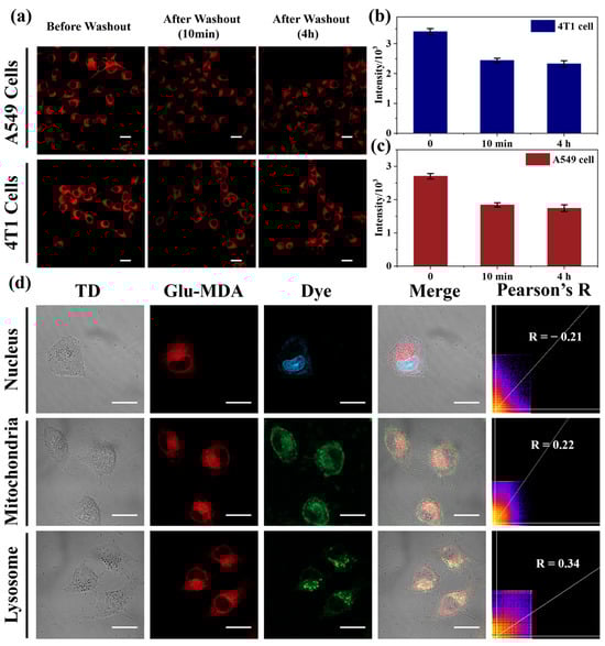 The subsequent phase of the study investigated the intracellular retention of fluorescent reaction products generated by the probe Glu-MDA during the detection of GGT in cells. A549 cells and 4T1 cells were selected as the experimental model [43]. The cells were incubated with a 5 μM concentration of the Glu-MDA probe in cell culture medium for 10 min at 37 °C. Following this, fluorescence microscopy was employed to capture images of the cells before and after the washing step. As shown in Figure 4a–c, the fluorescence intensity of the A549 cells and 4T1 cells decreased slightly after the washing procedure. The decrease in fluorescence intensity after washing can be attributed to the exchange of some fluorophores, which are released during the enzymatic reaction, with the external environment. Furthermore, the re-incubation period in the probe-free medium was extended to 4 h to monitor alterations in intracellular fluorescence intensity. It was observed that the fluorescence intensity remained relatively stable compared to the level recorded immediately after the washing step (Figure 4a–c). These findings demonstrate that Glu-MDA effectively visualizes endogenous GGT activity in cells and exhibits good intracellular retention of its fluorescent reaction products.
