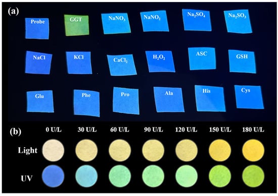 (a) The photograph of the Glu-MDA-coated filter papers with the different analytes under a 365 nm UV lamp. (b) Response of the Glu-MDA-coated filter papers to different concentrations of GGT (0–180 U/L) under a 365 nm UV lamp and under natural light.