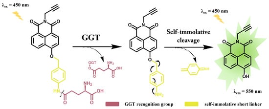 Fluorescent imaging technology, distinguished by its good sensitivity, non-destructiveness, and rapid detection capabilities, has attracted much attention for the detection of disease-related enzymes [14]. Fluorescent probes, the core component of fluorescence imaging technology, are primarily composed of fluorophores, linkers, and recognition groups [15,16]. Based on the catalytic properties of GGT, the γ-glutamyl group can serve as a recognition group in a GGT-responsive fluorescent probe, as GGT can efficiently cleave the amide bond within the γ-glutamyl group when the γ-glutamyl group enters the active pocket of GGT [17]. Additionally, the rational design and introduction of linkers in the probe can effectively reduce steric hindrance, consequently improving the reaction rate [18]. Notably, 4-aminobenzyl alcohol holds potential as a self-immolative linker due to its unique electron transfer properties [19]. Fluorophores such as coumarin, rhodamine, naphthalimide, cyanine, and BODIPY serve as core building blocks for fluorescent probes due to their fluorescence properties, with naphthalimide emerging as an ideal candidate for fluorophores, owing to its exceptional light stability and ease of modification [20,21]. Consequently, the rational integration of functional groups into a naphthalimide-based fluorescent probe is anticipated to enable the rapid detection of GGT and facilitate disease diagnosis efficiency.