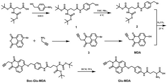 The fluorescent probe Glu-MDA was prepared by a six-step synthesis reaction, and the synthetic route is shown in Scheme 2. 1H NMR, 13C NMR, and HRMS of the compounds are provided in the Supplementary Materials.
