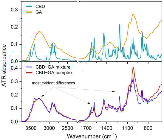 Measured ATR FTIR spectra. Upper diagram—ATR-FTIR spectra of CBD and GA compounds. Lower diagram—ATR-FTIR spectra of CBD-GA mixture and CBD-GA complex, both at molar ratio 1:2.