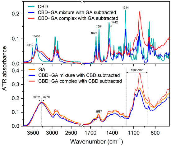 At first glance, the physical mixture (blue trace in the lower diagram of Figure 1) shows narrower and more intense bands attributed to CBD than the CBD-GA complex (red trace in the lower diagram of Figure 1), while in the range between 1200 and 900 cm−1, the bands attributed to GA are more intense for the CBD-GA complex than for the CBD-GA mixture. To gain further insight, we calculated difference spectra by subtracting the GA spectrum from the spectra of the mixture and the complex and subtracting the CBD spectrum at another time. The obtained difference spectra compared to the spectra of the compounds are shown in Figure 2.