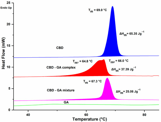 The DSC analysis revealed clear differences between the analysed samples (Figure 3). While virtually no observable changes were detected for GA within the measurement range (i.e., up to 110 °C), the observed phase change properties of CBD showed an almost symmetrical peak with a melting point of 69.0 °C and a melting enthalpy of 65.4 J/g. For the physical mixture CBD-GA, similar values for melting temperature and melting enthalpy to those for CBD were expected, but a decrease of about 1.7 °C was observed, with a less symmetrical peak. The expected enthalpy of melting of the mixture should be about 30 J/g due to the 47% mass content of CBD in the mixture (at a CBD:GA molar ratio of 1:2). However, the enthalpy was about 20% lower than the predicted value. A possible explanation for the behaviour of the CBD-GA mixture could be the formation of a eutectic mixture during the melting process, although the differences are not as pronounced as in the case of ascorbic acid and sugar [32], for example. In contrast to the mixture, the CBD-GA complex showed an even lower melting point around 3.0 °C compared to pure CBD but with a 50% higher enthalpy value compared to the CBD-GA mixture. This clearly indicates the existence of intermolecular CBD-GA interactions in the complex, which is consistent with the observations of the FTIR analysis. These interactions are most likely due to hydrogen bonding, which may even lead to the formation of co-crystals [33,34]. The melting behaviour of the complex shows a very asymmetric, overlapping double peak, which could indicate some heterogeneity or multiple structural domains within the complex (in the solid state). However, further studies using complementary techniques would be required to substantiate this hypothesis.