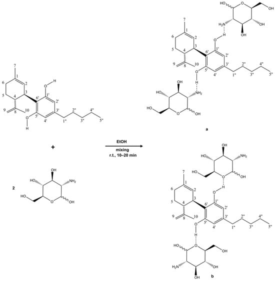 The reaction scheme and hypothetical structures of the complex between CBD and glucosamine. Based on the measurements, it can be concluded that interactions occur between the hydroxyl groups of CBD and the –NH2 groups (a) and the C–O–C groups (b) of glucosamine. The dotted lines represent putative hydrogen bonding.