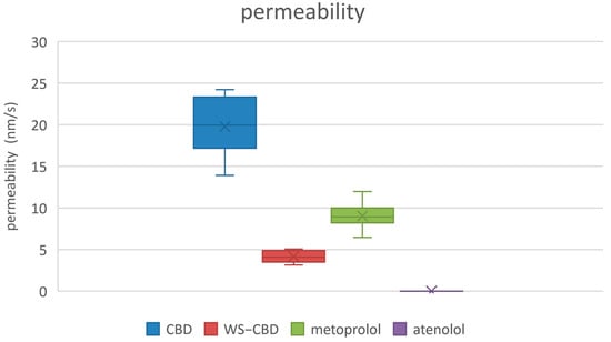 Measured permeabilities of studied substances. CBD—regular cannabidiol; WS-CBD—water-soluble cannabidiol (CBD:GA molar ratio 1:2).
