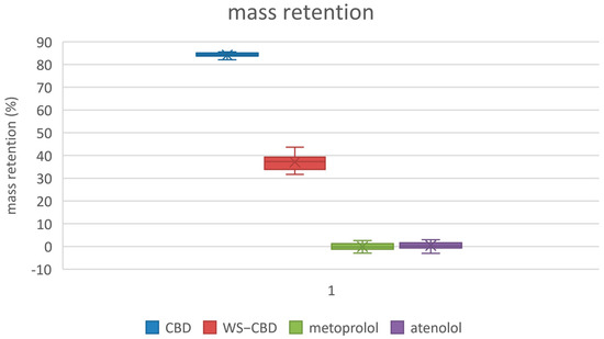 Membrane mass retention of substances. CBD—regular cannabidiol; WS-CBD—water-soluble cannabidiol (CBD:GA molar ratio 1:2).