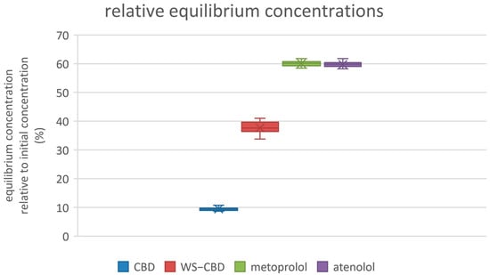 Relative equilibrium concentrations of substances. CBD—regular cannabidiol; WS−CBD—water-soluble cannabidiol (CBD:GA molar ratio 1:2).