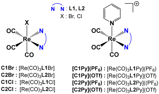 Re(I) tricarbonyl complexes were prepared following a modified procedure from the literature [6]. A total of eight different complexes (Figure 2) were synthesized. Complexes C2Cl, C1Cl, [C2Py](PF6) and [C1Py](PF6) were prepared starting from the commercially available [Re(CO)5Cl] (Figure 2). All the other tricarbonyl complexes were prepared from [Re(CO)5Br], which is easily synthesized by the oxidation of commercial dirhenium decacarbonyl with bromine [33].