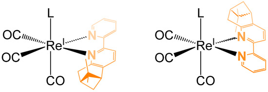 With a coordination number of 6, fac-ReI(CO)3 complexes possess three other coordinating sites in addition to the three carbonyls, respecting a classical octahedral geometry. The three carbonyl ligands could be considered as a unit, and the geometry of the complex will therefore be comparable to a pseudo-tetrahedral geometry, inevitably creating a stereogenic Re(I) metal center as long as the other three monodentate ligands are different. If a non-chiral bidentate ligand is used, i.e., 2,2′-bipyridine, the metal center is not chiral. But if the bidentate ligand is chiral, as are the two enantiopure ligands L1 and L2, the metal center can have two configurations. In this case, two diastereoisomers can be obtained (same chirality of the ligand but opposite configurations of the metal center).