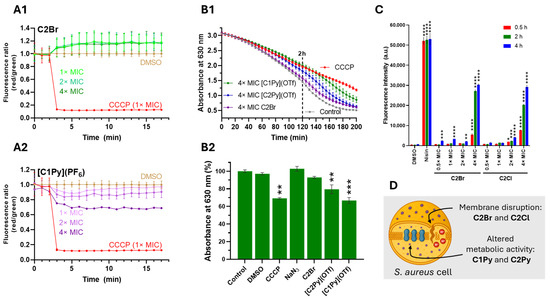 Since membrane depolarization may stem either from direct membrane disruption or from interference with the electron transport chain [49], we evaluated the cells’ reducing capacity by monitoring the conversion rate of resazurin to resorufin [50,51]. The incubation of S. aureus MRSA cells with the complexes did not significantly reduce the reductive capacity of the bacteria (Figure S22). Only [C1Py](OTf) at 4× MIC showed an effect comparable to that of the electron transport chain decoupler CCCP, after 2 h to 3 h of incubation (Figure 6B). Next, we examined the integrity of the cytoplasmic membrane by incubating S. aureus MRSA cells with the complexes along with the non-permeant dye propidium iodide (PI) in a concentration- and time-dependent assay. PI, which cannot cross intact cell membranes, enters only when the membrane is compromised; once inside, it intercalates with DNA to emit red fluorescence [52]. Of all the active molecules tested, only C2Br and C2Cl facilitated PI uptake at a 4× MIC concentration (Figure 6C and Figure S23), showing comparable results to the positive control nisin [52].