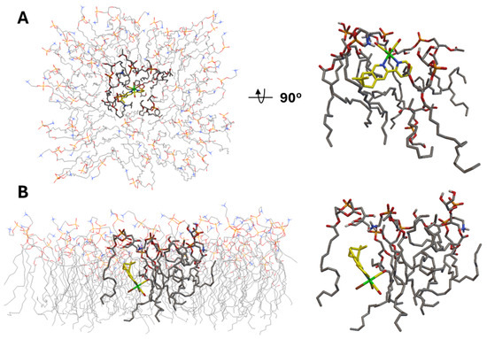 Next, we moved to the interaction analysis of C2Br and C2Cl with the bacterial cytoplasmic membrane. We mentioned above that the two complexes uniquely disrupt the cytoplasmic membrane integrity. Therefore, we analyzed the in silico interaction of C2Br with a semi-flexible POPG:POPE membrane model constructed on the basis of what was reported by Jämbeck and Lyubartsev (Figure 7) [57]. The results of this analysis revealed two major interactions of C2Br with the membrane model, which we refer to as insertion (Figure 7A, −10.3 kcal/mol) and embedding (Figure 7B, −13.2 kcal/mol). Insertion of C2Br in the lipid layer occurs via the L2 ligand, with the structure being stabilized by weak, electrostatic H-bonding interactions between the lipids’ amino and glycero head groups and the Re-bound Br and CO ligands (2.7 and 3.5–4 Å, respectively, Figure S25). In addition to insertion, a lower-energy model interaction reflects the embedding of the complex in the lipid layer (Figure 7B). In this conformation, disruption of lipid compactness in favor of a pocket housing the complex is evident in Figure 7B and may help to explain the experimental data collected in the PI assay mentioned in the previous section.