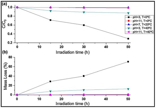 Glass container; a 215 mm distance of dispersion with catalyst from the visible LED; irradiation with a lamp of 50 W (400–800 nm) for 50 h, with continuous stirring at 300 rpm, at room temperature |