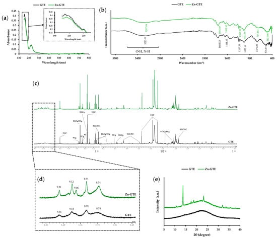 Structural characterization of Zn-GTE. (a) UV–Vis spectra of GTE and Zn-GTE in the wavelength range of 190–800 nm. (b) FT-IR spectra of GTE and Zn-GTE in the wavenumber range of 400–4000 cm−1. (c) Overview of the 1H-NMR spectra of GTE and Zn-GTE. (d) Enlarged spectral region (8.0–9.5 ppm) corresponding to the OH group of GTE and Zn-GTE. (e) PXRD patterns of GTE and Zn-GTE.