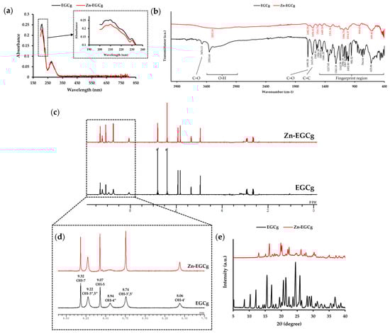 Structural characterization of Zn-EGCg. (a) UV–Vis spectra of EGCg and Zn-EGCg in the wavelength range of 190–800 nm. (b) FT-IR spectra of EGCg and Zn-EGCg in the wavenumber range of 400–4000 cm−1. (c) Overview of the 1H-NMR spectra of EGCg and Zn-EGCg. (d) Enlarged spectral region (8.0–9.5 ppm) corresponding to the OH group of EGCg and Zn-EGCg. (e) PXRD patterns of EGCg and Zn-EGCg.
