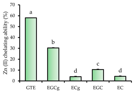 Zn (II) chelating ability of GTE, EGCg, ECg, EGC, and EC. The data represent mean ± SE, and different letters indicate significant differences (p < 0.05).