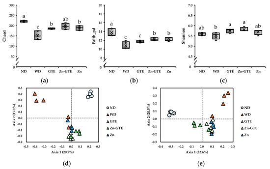 We evaluated alpha-diversity using Chao1 (species richness), Faith’s phylogenetic diversity (Faith_pd, phylogenetic richness), and Shannon (species evenness) indices. As shown in Figure 4a,b, species richness (Chao1 and Faith_pd indices) significantly decreased in the WD group compared to the ND group, confirming that the WD induced gut dysbiosis. All treatments mitigated the WD-induced reduction in the Chao1 index. Notably, Zn-GTE and Zn supplementation significantly restored the Faith_pd index. In addition, both GTE and Zn-GTE improved species evenness, as indicated by the Shannon index (Figure 4c).