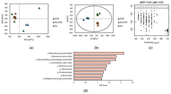 To identify key bacterial genera driving differences among the GTE, Zn-GTE, and Zn groups, we performed unsupervised principal component analysis (PCA) and supervised partial least squares discriminant analysis (PLS-DA) based on the relative abundances of 87 detected genera. These analyses were chosen to visualize and highlight the most influential genera contributing to the observed group differences and to determine the underlying microbial patterns associated with each treatment. As shown in Figure 5a, principal components 1 (PC1) and 2 (PC2) explained 27% and 16% of the total variance, respectively, and enabled classification of the treatment groups in the PCA score plot. The GTE and Zn-GTE groups clustered on the negative side of PC1, whereas the Zn group clustered on the positive side. However, GTE and Zn-GTE were not clearly separated in the PCA score plot.