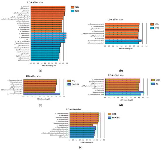 Effect of samples on abundant taxa of gut microbiota. (a) Differences in the composition of groups by linear discriminant analysis (LDA) effect size (LEfSe) analysis between ND and WD, (b) WD and GTE, (c) WD and Zn-GTE, (d) WD and Zn, and (e) GTE and Zn-GTE. The threshold for the logarithmic LDA score was set to 2.0.