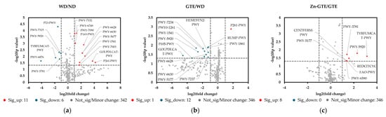 Effect of samples on gut microbial metabolic pathway by metagenome predictions (PICRUSt2) against Metabolic Pathways From all Domains of Life (MetaCyc) database. (a) Volcano plot based on the abundance of MetaCyc pathways between ND and WD, (b) WD and GTE, and (c) GTE and Zn-GTE.