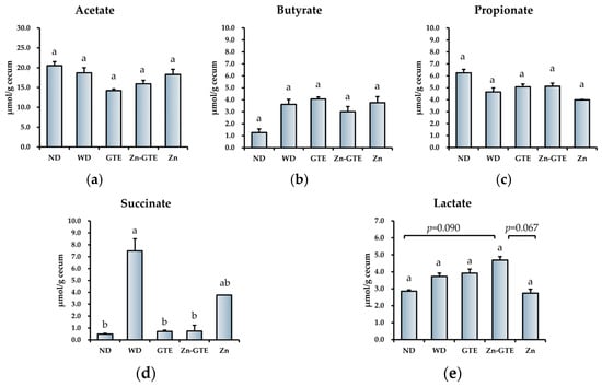 Effect of samples on organic acids’ composition in the cecum. (a) The content of acetate, (b) propionate, (c) butyrate, (d) succinate, and (e) lactate. The data represent mean ± SE, and different letters in the same column indicate significant differences (p < 0.05).
