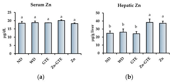 We further evaluated the effects of the samples on Zn status in serum and liver. Figure 9 shows the serum and hepatic Zn contents across all experimental groups. No significant differences were observed in serum Zn levels among the groups (Figure 9a). However, hepatic Zn levels were significantly higher in the Zn-GTE and Zn groups compared to the WD group, whereas GTE alone had no significant effect relative to WD (Figure 9b).