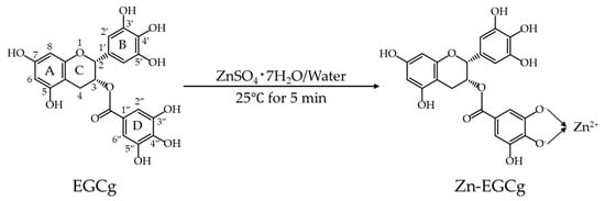 In recent years, many researchers have developed metal–EGCg complexes to overcome the limitations associated with EGCg, including its poor stability and low bioactivity. EGCg serves as an excellent metal ion chelator due to the presence of multiple phenolic hydroxyl groups in its molecular structure. Manganese (Mn), iron (Fe), copper (Cu), zinc (Zn), cadmium (Cd), and other metals have been used to form promising metal–EGCg complexes [8,9,10,11,12,13]. Among these, Zn plays a crucial role in human growth and development and is considered an ideal candidate for complex formation due to its strong chelating ability and excellent biocompatibility. It has been reported that EGCg can form a complex with Zn (II) and facilitate Zn (II) ion transport into cells by acting as an ionophore [14,15]. Moreover, the Zn-EGCg complex exhibits enhanced stability, antioxidant capacity, and anti-cancer activity compared to native EGCg [16,17].