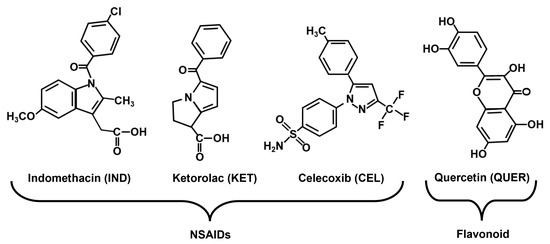 Chemical structures of some non-steroidal anti-inflammatory drugs (NSAIDs), suchas indomethacin (IND), ketorolac (KET), and celecoxib (CEL), as well as quercetin (QUER), a flavonoid.