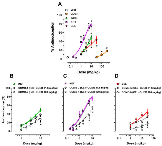 (A) Dose-response curves (DRCs) of the antinociceptive effect of quercetin (QUER, 31.6–316 mg/kg, ip), indomethacin (IND, 1–10 mg/kg, po), ketorolac (KET, 0.31–10 mg/kg, po), and celecoxib (CEL, 1.0–31.6 mg/kg, po) in individual administration. Each point represents the mean ± S.E.M. of six animals. * p < 0.05 vs. VEH group. (B) Antinociceptive effect induced by IND (1–10 mg/kg) in the absence and the presence of 31.6 mg/kg QUER (COMB-1) or 100 mg/kg QUER (COMB-2). (C) Antinociceptive effect induced by KET (0.31–10 mg/kg) in the absence and the presence of 31.6 mg/kg QUER (COMB-3) or 100 mg/kg QUER (COMB-4). (D) Antinociceptive effect induced by CEL (0.31–31.6 mg/kg) in the absence and the presence of 31.6 mg/kg QUER (COMB-5) or 100 mg/kg QUER (COMB-6). Each point represents the mean ± S.E.M. of the six animals per group. In this analysis, the effect of the individual administration of QUER was not considered. * p < 0.05 vs. effect induced by the corresponding NSAIDs in individual administration, two-way ANOVA followed by Tukey’s test.