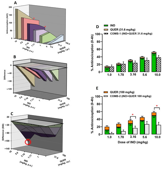 (A–C) Three-dimensional graphics from the analysis of the interaction of the antinociceptive effect of the combination of indomethacin (IND) with QUER. (A) Doses of IND (Y-axis) and QUER (X-axis) and their antinociceptive effects in individual administration or in combination (Z-axis). (B) Subtraction of the antinociceptive effect of each combination minus the individual effect of IND and QUER. (C) Surface of synergistic interaction of the antinociceptive effect of indomethacin (IND) with QUER. The red circle indicates the combination that induced the maximum antinociceptive interaction (MAI) of this combination. (D,E) Two-dimensional graphics showing the individual effects of IND and QUER at 31.6 mg/kg (D) or 100 mg/kg (E). In both, the first bar shows the antinociceptive effect of IND and QUER in individual administration and represents the sum of the individual effects of the drugs (expected effect), while the second bar (with a white background) represents the antinociceptive effect obtained experimentally with the respective combination. * p < 0.05 vs. expected effect (addition of the antinociceptive effect of IND and QUER in individual administration). Two-way ANOVA followed by Tukey’s test.